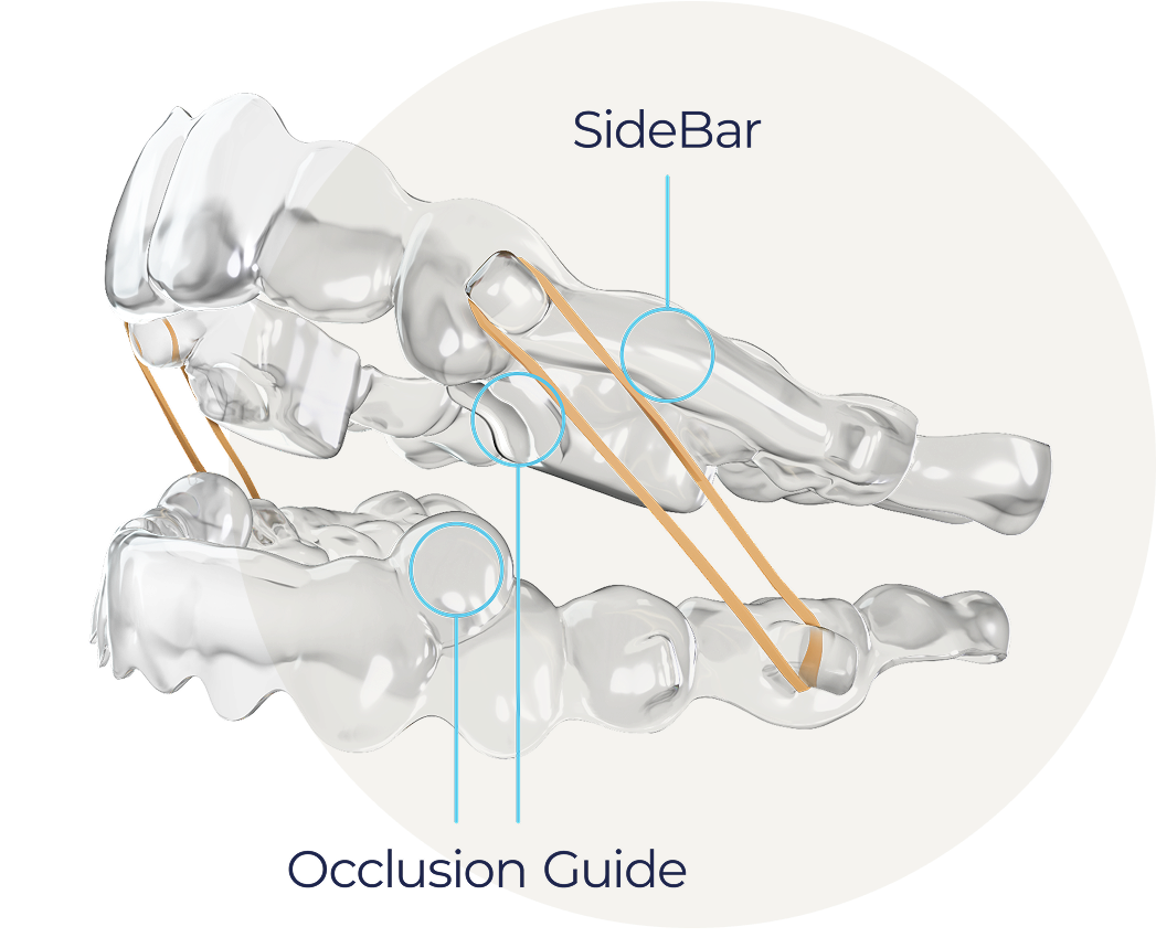 Spark™ BiteSync è un sistema di correzione di classe II che garantisce l’avanzamento mandibolare sincronizzato, la distalizzazione mascellare e l’allineamento dentale senza la necessità di un apparecchio separato. Il sistema è costituito da una guida occlusale e da una barra laterale, collegate e azionate da elastici di Classe II, che possono essere utilizzate insieme o indipendentemente.